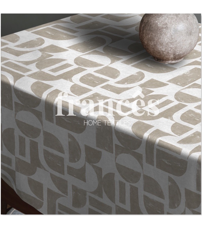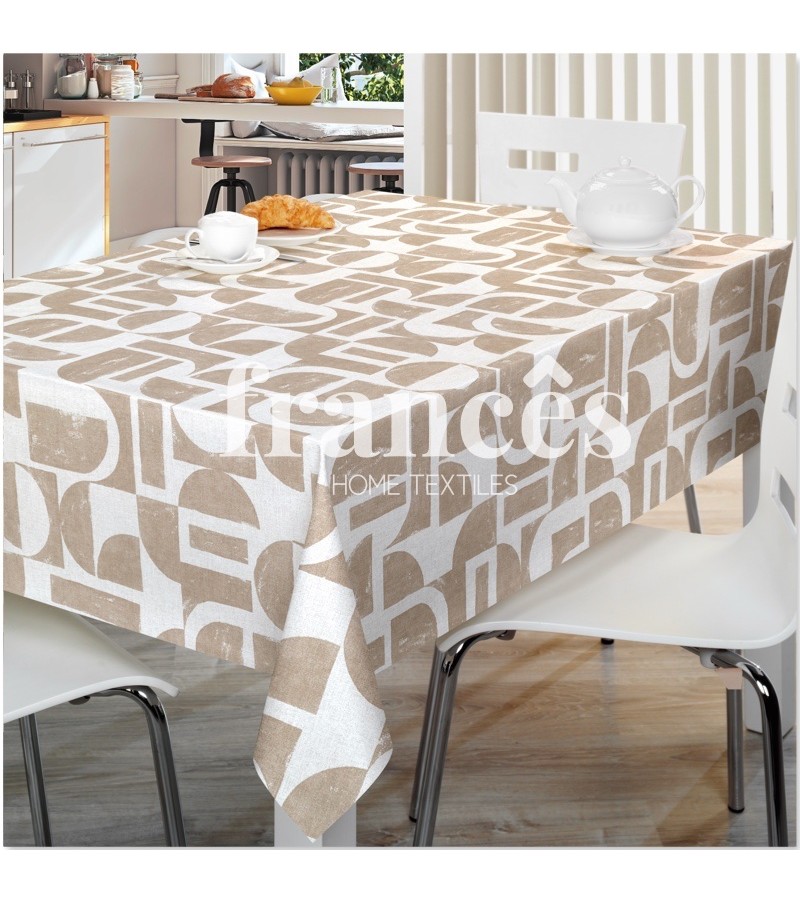 Table cover with printed PVC with a nonwoven base.